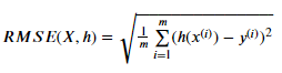 - RMSE(X, h) : 모델 h가 얼마나 좋은지 평가하는 지표, 또는 비용함수(cost function)