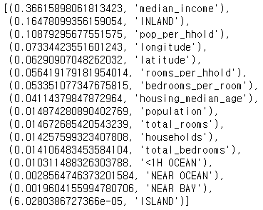 RandomForest 모델에 따면 가장 중요한 특성은 median income이고, 다음은 범주형 특성을 one-hot encoding으로 변환해준 데이터가 중요하다는 것을 알 수 있다.