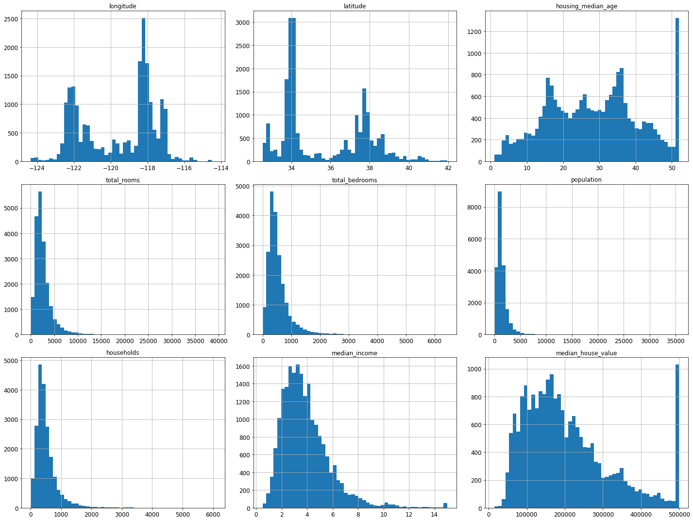 - housing_median_age : 해당 지역의 집들을 기준으로 연도를 조사한 중간값